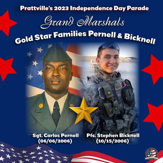 “The City of Prattville is excited to the honor local Gold Star families of Sgt. Carlos Pernell and Pfc. Stephen Bicknell as the Grand Marshals of the 2023 Independence Day Parade. Gold Star families are those who lost a loved one in the service of our country and Pernell and Bicknell made the ultimate sacrifice in combat for our country and the loved ones they left behind.