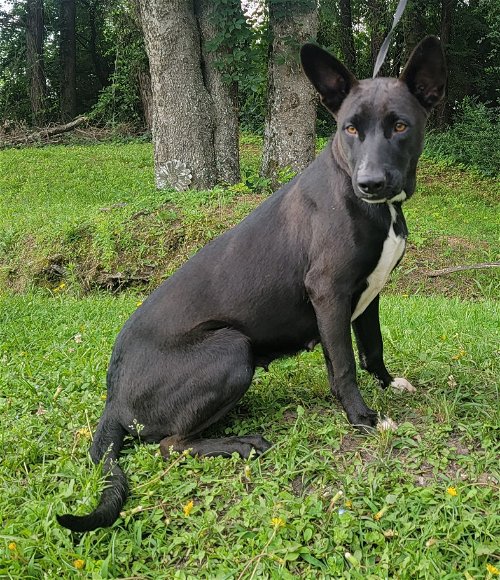 Courtney is a four-year old, female Lab/Pit looking mix, about 40 lbs. Found as a stray and brought to us. She loves attention, is super sweet and is great with other dogs. Gotta luv those ears!