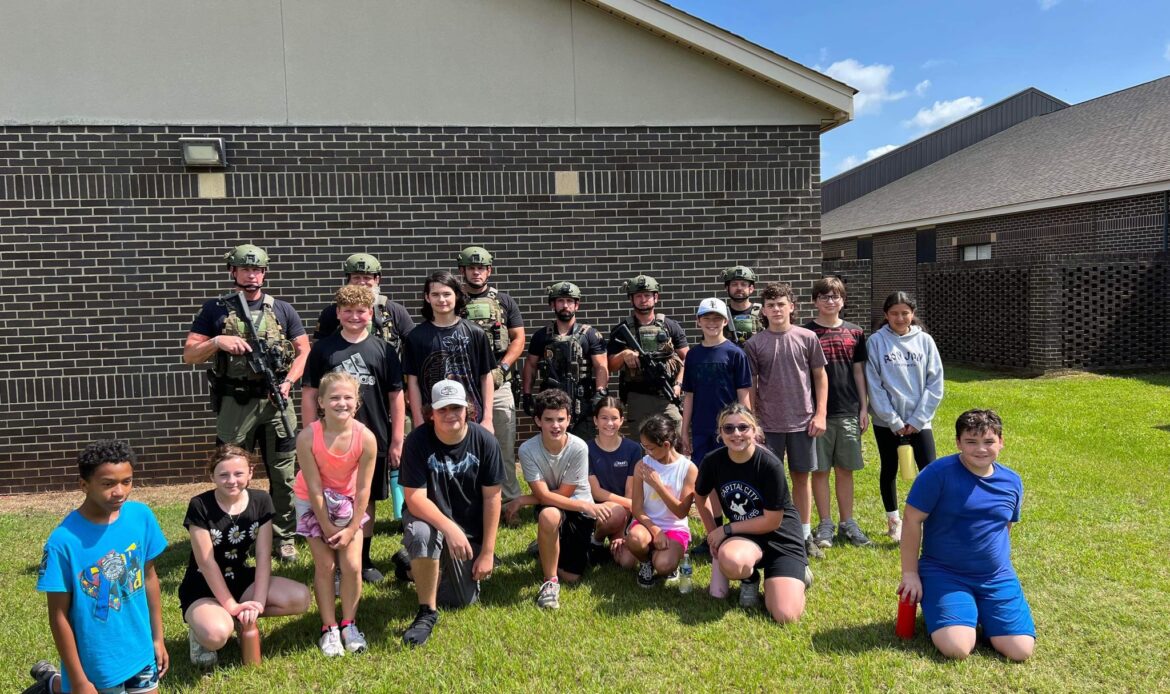 Throughout the week, each camper learned about building clearing, hostage negotiations, criminal investigations, Special Weapons and Tactics (SWAT) from Elmore County Sheriff’s Office, how to handle a weapon properly, K-9 officer training, and self-defense.