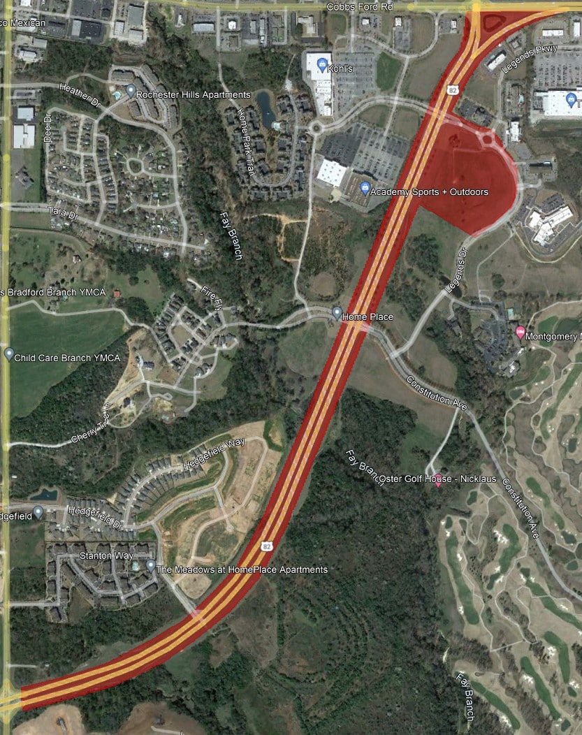 This includes all applicable shoulders and median of HWY 82 East, the Legends Dr./Legends Pkwy. roundabout, and the hill surrounding the Home Place clock tower. THIS ALSO EXTENDS (SHOULDERS AND MEDIAN) ON HWY 82 FROM COBBS FORD ROAD ALL THE WAY TO MCQUEEN SMITH RD!!! (SEE SECOND MAP)