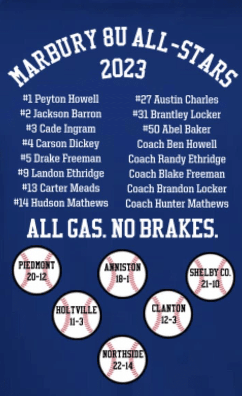 Congratulations to the Marbury 8U All-stars! The team recently went 6-0 at USSSA state tournament for kid pitch on June 24th. The team also won Regionals, going 3-0 in bracket play. Well done team members, coaches and parents.