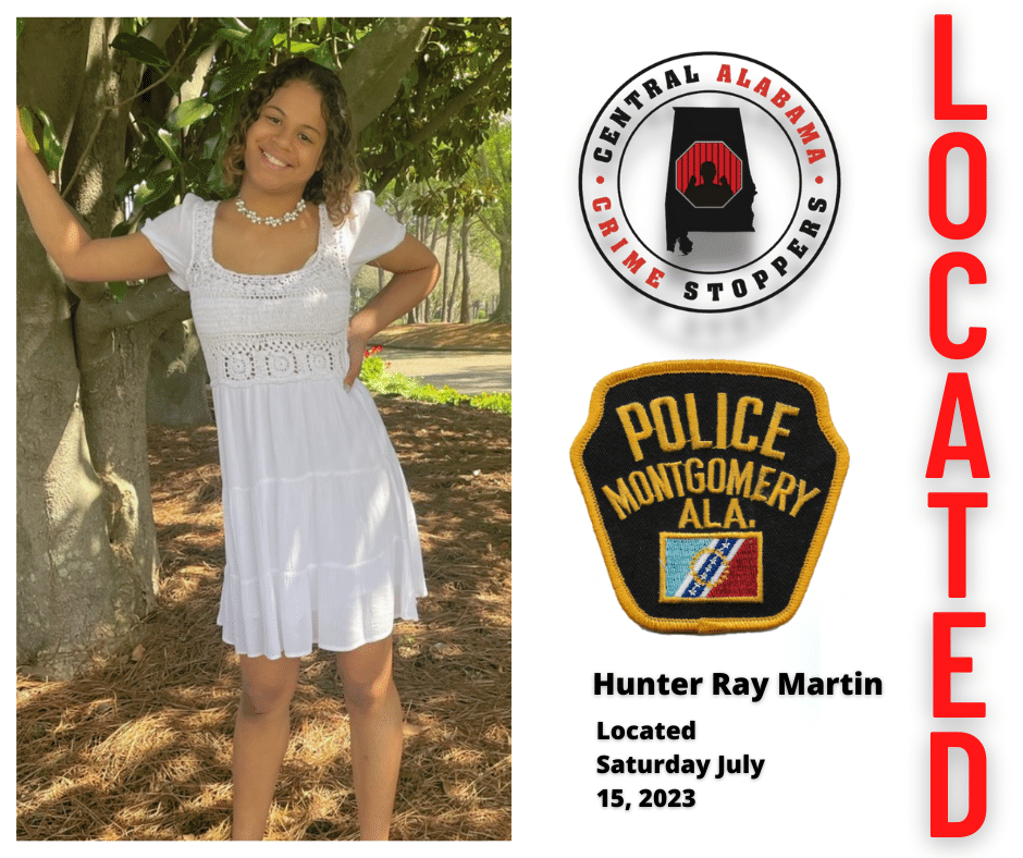 The Montgomery Police Department notified CrimeStoppers and advised Missing Juvenile, Hunter Ray Martin, 16, has been located.