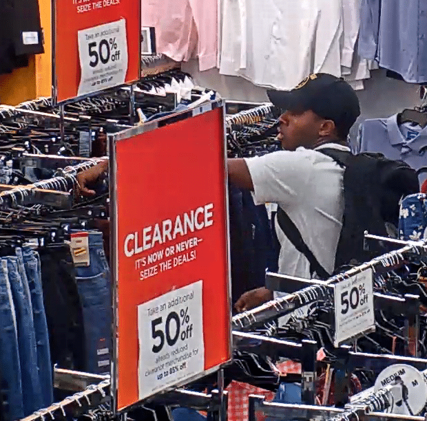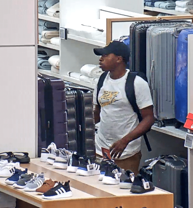 Investigators say the pictured suspect, identified as a black male, was seen wearing a dark-colored baseball cap with a golden-colored logo, khaki pants, a white Nike T-shirt, and a dark-colored backpack. The suspect used the store’s emergency exit to leave the business with $541.99 worth of merchandise that was not paid for. The suspect left the area in an unknown direction of travel. There are no other details available for release at this time.