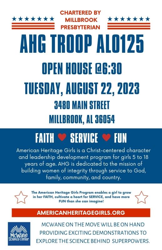 American Heritage Girls is a Christ-centered character and leadership development program for girls 5 to 18 years of age. AHG is dedicated to the mission of building women of integrity through service to God, family, community, and country.