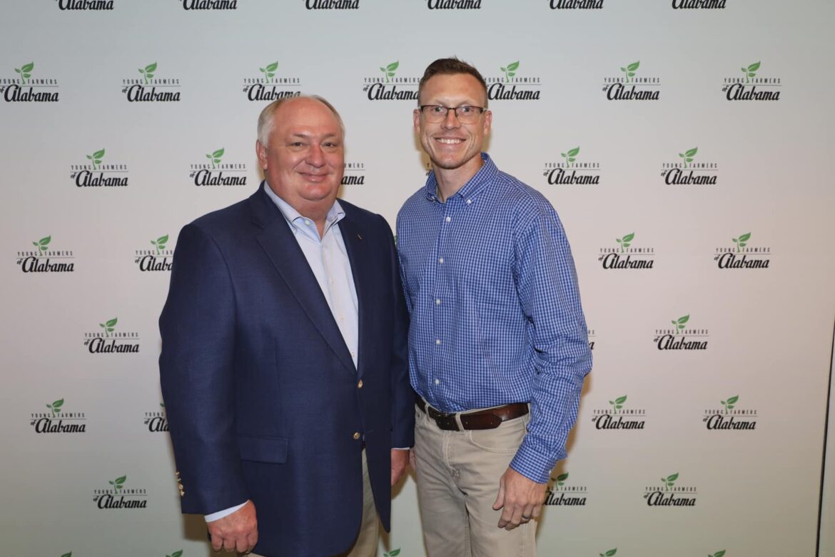 Top Photo: Elmore County Young Farmer Daniel Free, right, competed in contests during the Alabama Farm & Land Expo Aug. 12 in Mobile. Free competed in the Young Farmers Discussion Meet. He was one of 22 contestants in the meet, which simulates a committee meeting where participants discuss solutions to agricultural issues. He is pictured with Alabama Farmers Federation President Jimmy Parnell.