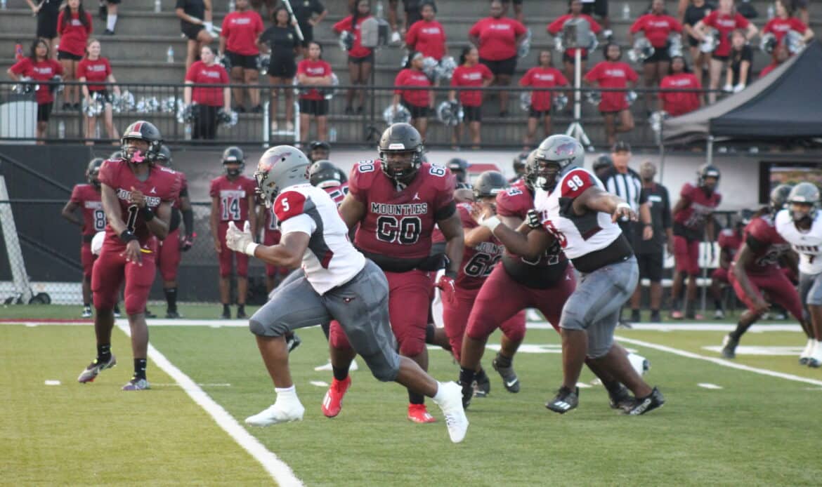 After a scoreless 1st quarter, the Mustangs’ defensive line came up with a big sack on 3rd and long, pushing the ball back to the Mounties 15-yard line. They managed only a 20-yard punt. The Mustangs converted the field position into points. Quarterback Jacob Bryant had a 28-yard rush and followed it up with a 2-yard touchdown run to score the first points of the season.
