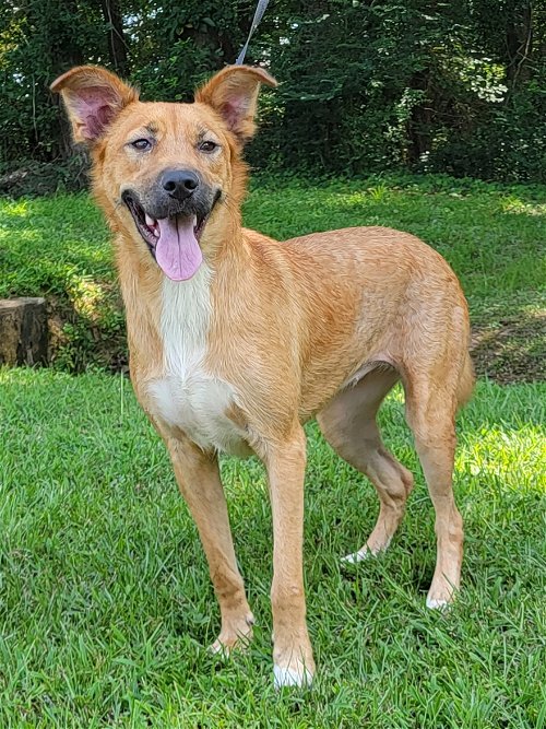 Pongo is 17 months old, female Lab/Shep mix, about 50 lbs. She is a wonderful dog, playful & loving, great with children, other dogs & cats, may be housetrained. Pongo says – get me outta here and into a loving home!