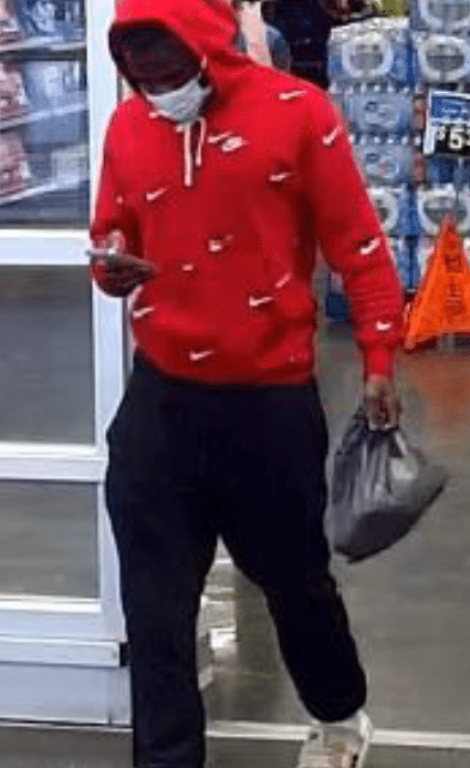 Investigators say the pictured suspect identified as a black male was seen wearing a red Nike hoodie, black sweatpants, and a face mask. The suspect made a purchase using the stolen debit card and left the scene in an unknown direction of travel. There are no other details available for release at this time.