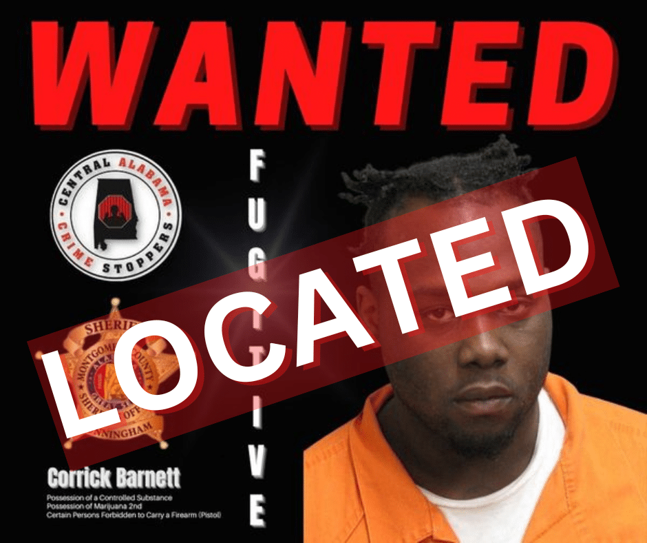 The Montgomery County Sheriff’s Office notified Central Alabama CrimeStoppers and advised they have located fugitive, Corrick Barnett, 30.
