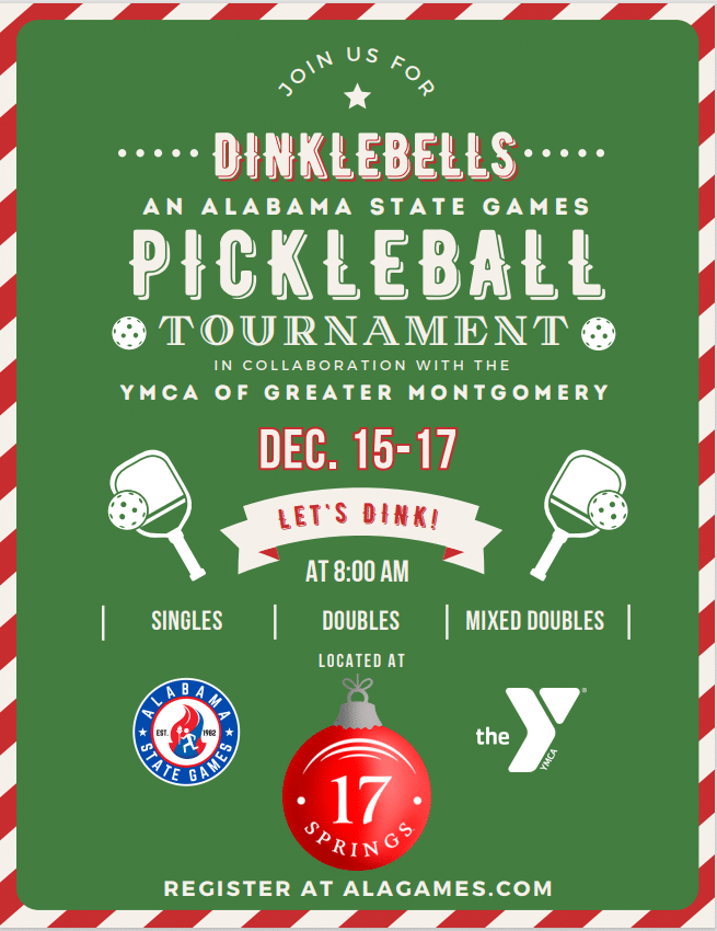 Register now for the inaugural DINKLEbells Pickleball Tournament December 15-17 at The Fields of 17 Springs in Millbrook hosted by the Alabama State Games and the YMCA of Greater Montgomery. This exciting first-time event promises to bring Pickleball players and fans from across the state together to relish a day of spirited competition and camaraderie. This event is open to all Pickleballers from throughout the state.
