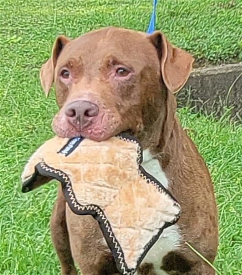 Rainey is a 5 ½-year old-female Pit/Lab girl who is just as sweet as they come. She was adopted from us as a pup and sadly found as a stray whose adopter could never be contacted. As a pup she loved toys and was very happy carrying them around all day. She is still just as loving and sweet, great with other dogs.