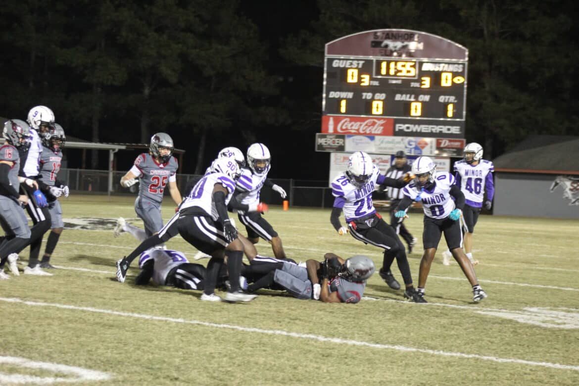 The Mustangs’ defense came up with a fumble recovery at the SEHS 45-yard line with 1:20 remaining, giving the offense an opportunity to tie the game, but before running a play, the Mustangs had a delay of game penalty. The Mustangs were able to move the ball into Minor territory and faced a 4th down with 20 seconds left in the game, but Bryant was sacked on his drop back and unable to get a pass attempt off.