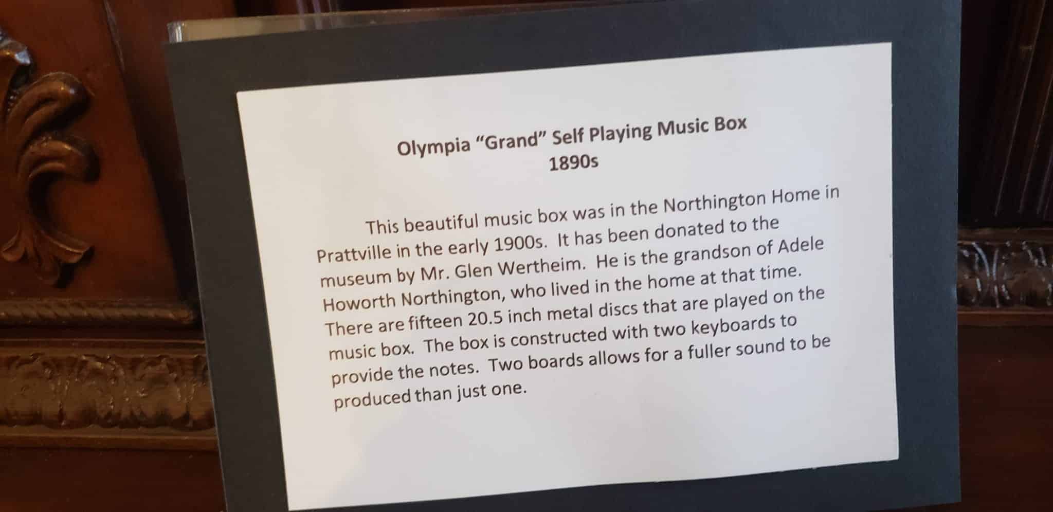 There is also a very large standing music box. Many portraits of Daniel Pratt and his family can be found, as well as extensive information about the founding of Prattville.