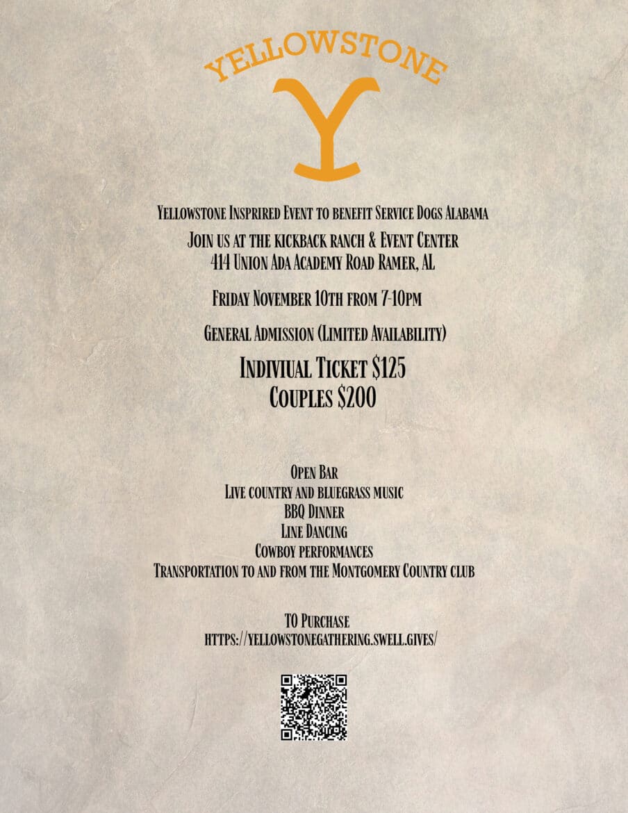 Service Dogs Alabama (SDA) will be hosting a fundraising event on Friday, November 10th, 2023. The Gathering will be a Yellowstone themed party at The Kickback Ranch and Event Center in Ramer, AL. beginning at 7 p.m. Proceeds will help support the placement of Service Dogs with youth, adults, and veterans with disabilities, as well as Facility Dogs where trauma is prevalent.