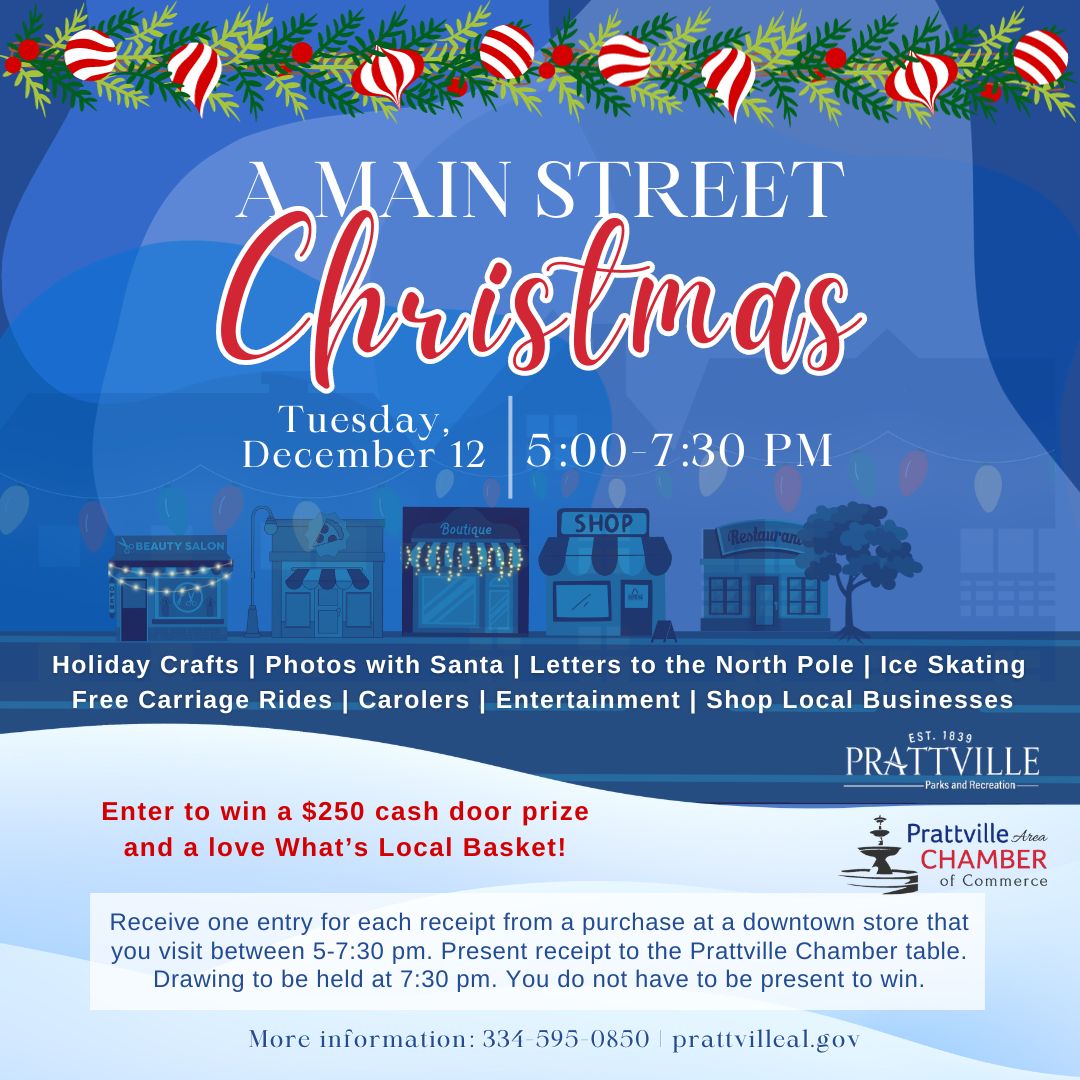 Save the date for A Main Street Christmas, scheduled for December 12, 2023, from 5:00-7:30 P.M. in Historic Downtown Prattville!