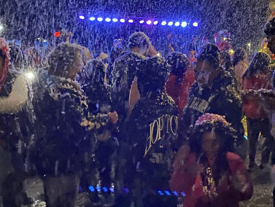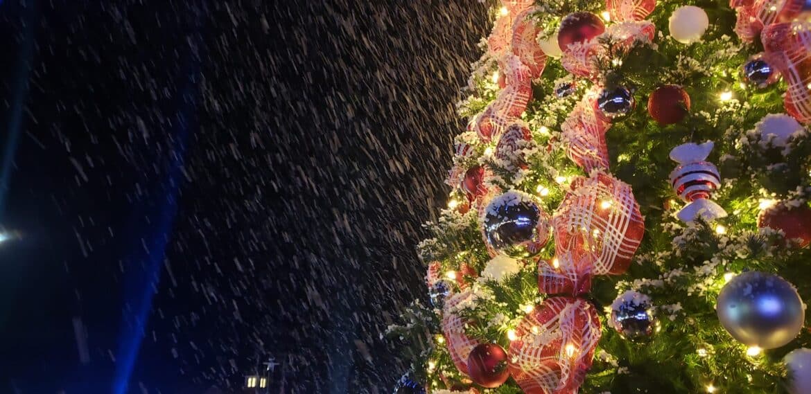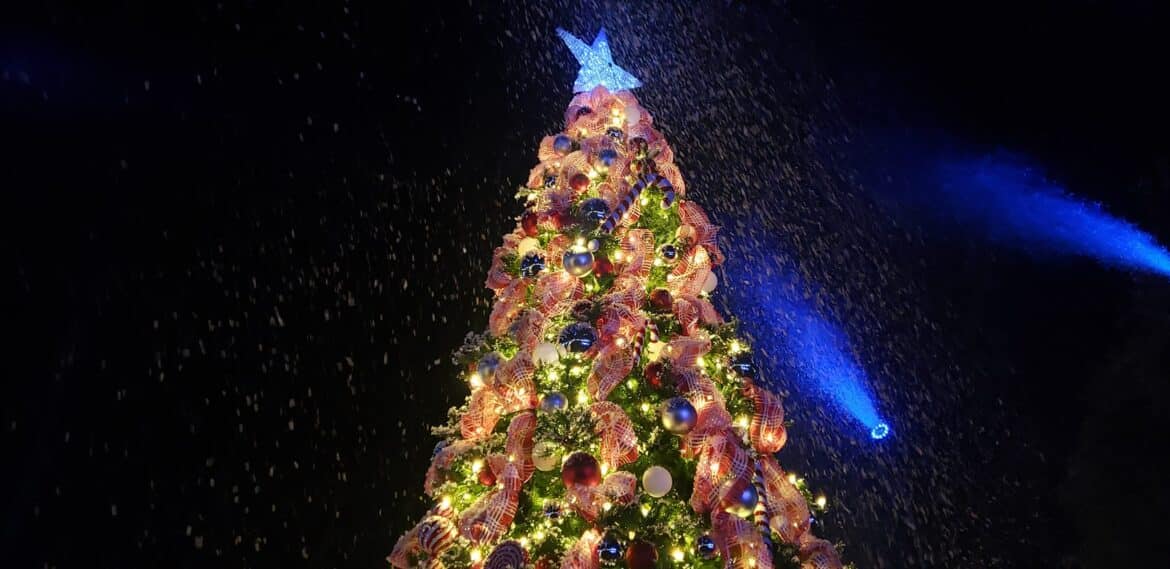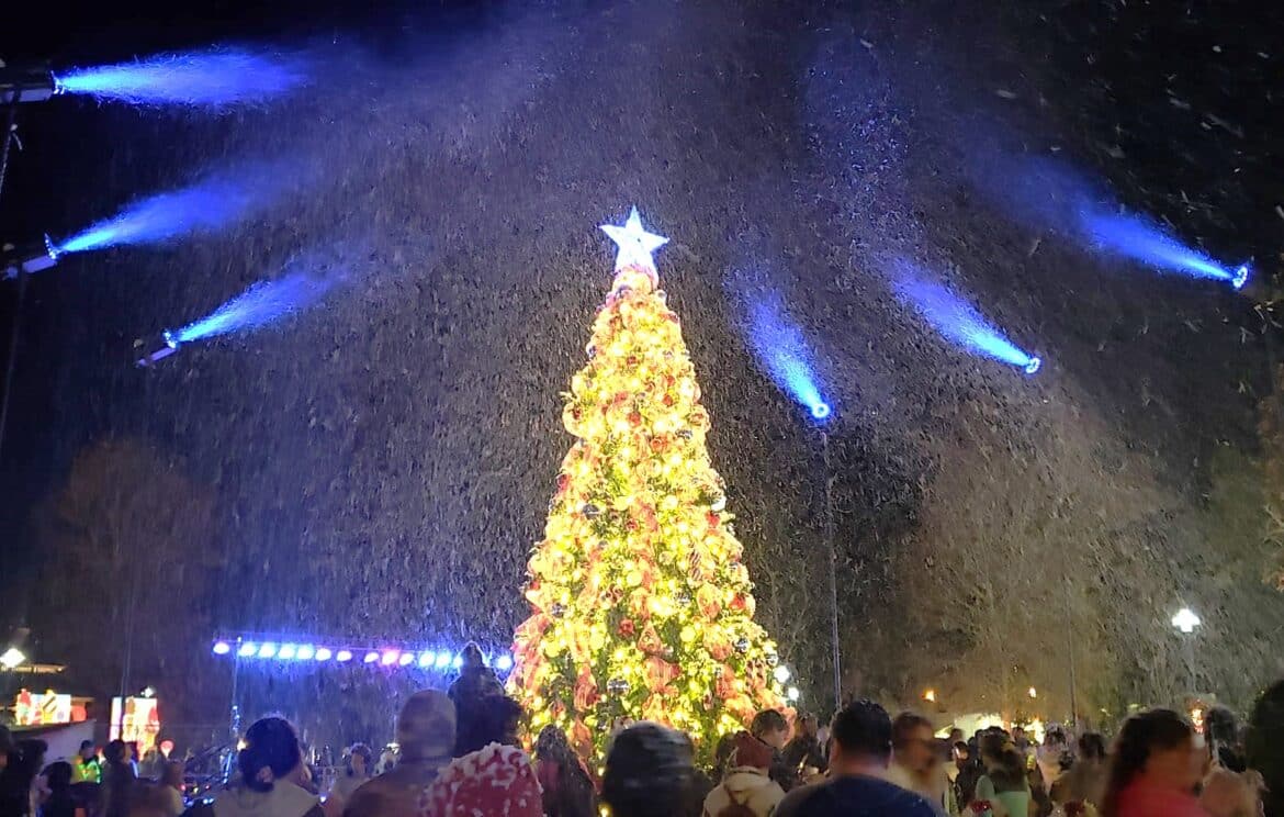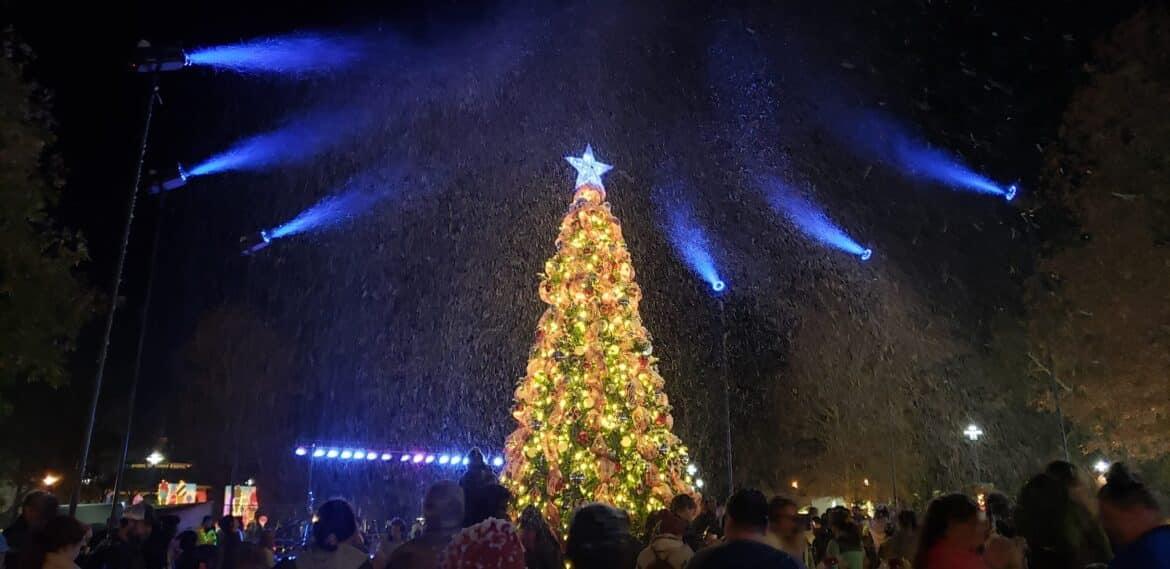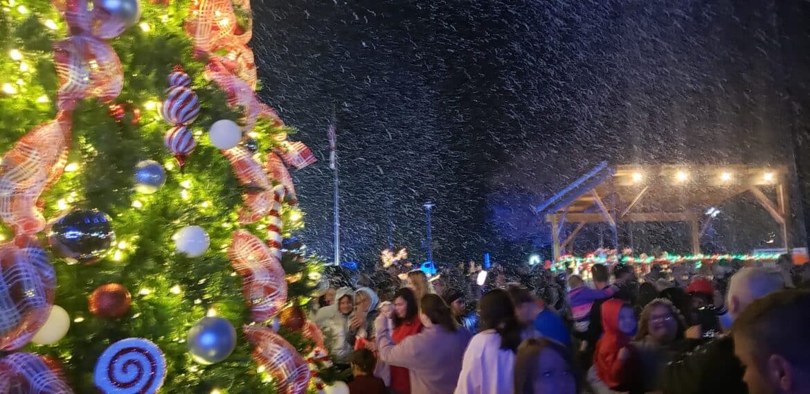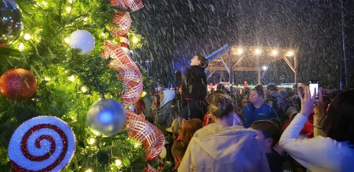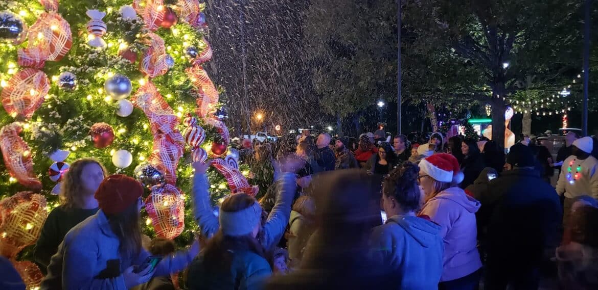 With a creatively decorated backdrop at Village Green Tuesday, the large crowd cheered as the official city Christmas tree was lit, and snow began to fall.
