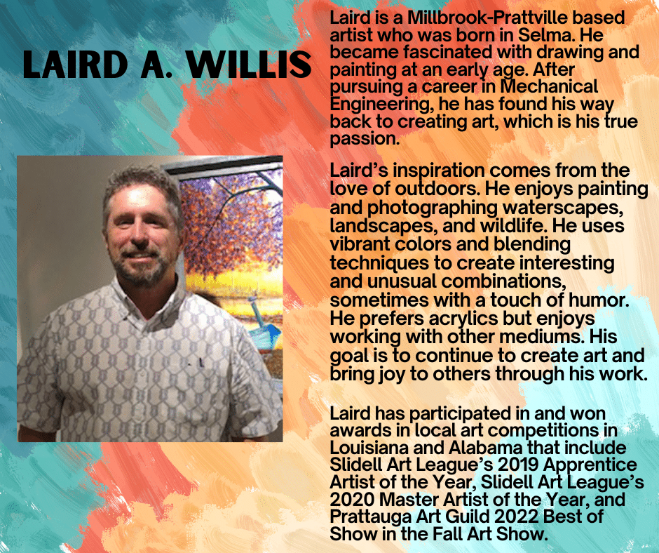 Laird is a Millbrook-Prattville based artist who was born in Selma. His inspiration comes from the love of the outdoors. See graphic below for more information.