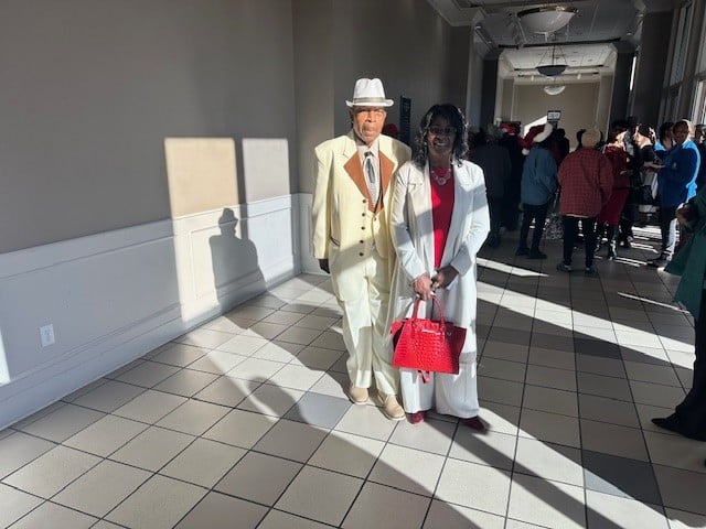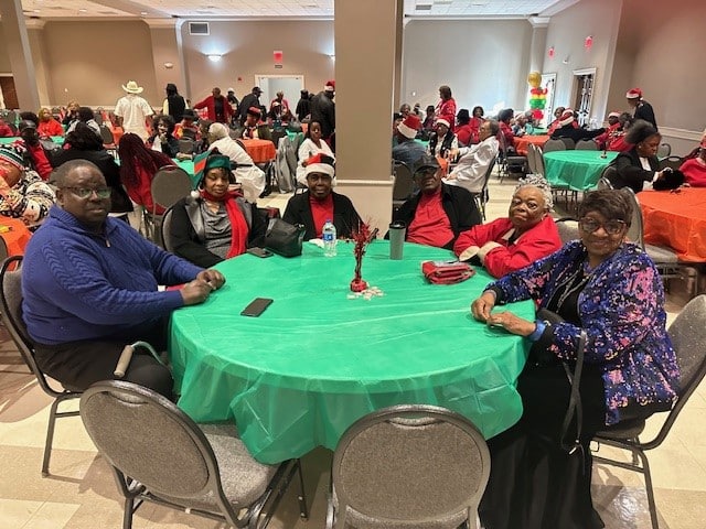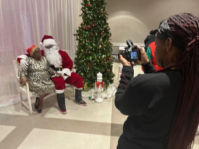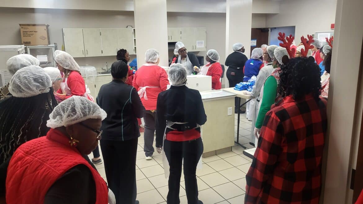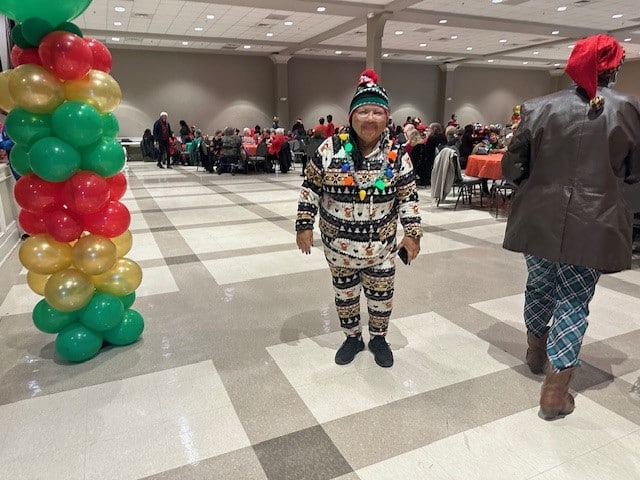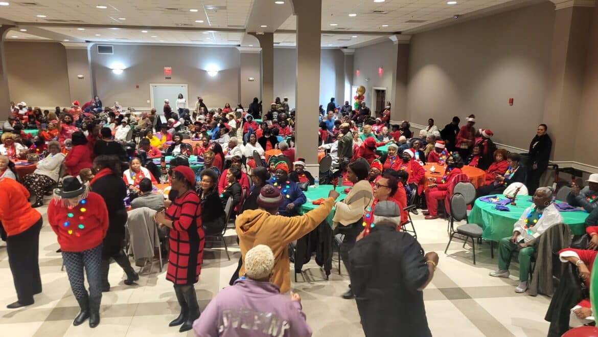 A big tradition at the party is dancing to golden oldies and to favorite Christmas carols. Lunch was served, with chicken, macaroni, black eyed peas, and cornbread washed down with juice or milk. Nobody went home hungry. So many people came to the party that Daisy Bolden, our organizer, and our Nutrition Coordinator had to order more meals.