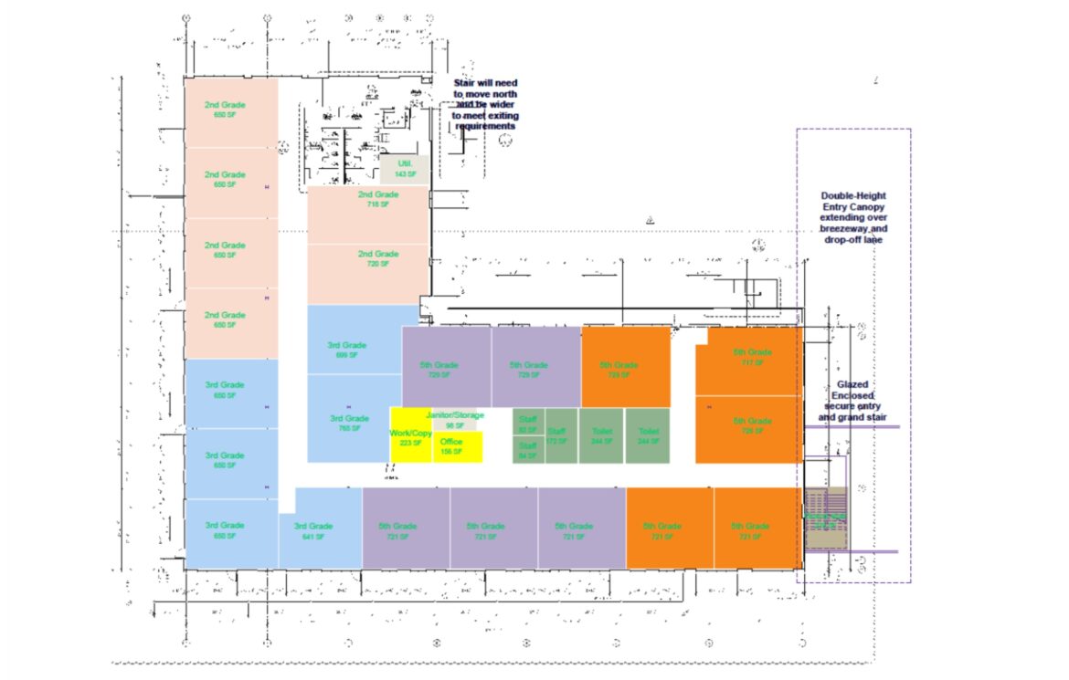 The construction currently planned is projected to be complete by 2026, and it will be broken up into three phases. Phase one is getting the K-5th in the building across from JC Penney and Peace of Cake. The bottom floor will have kindergarten and first grade while the top floors will serve second through fifth grades.