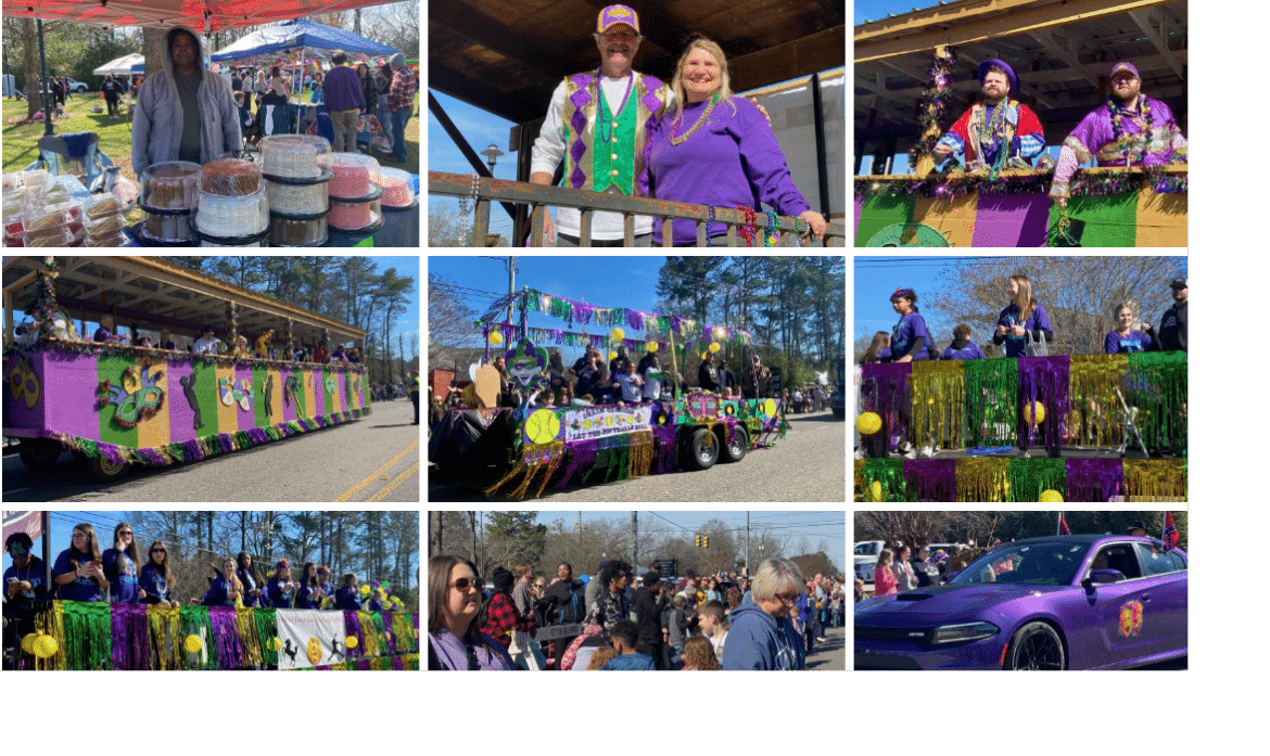 The Mardi Gras Parade starts at noon after the staging at Mill Creek Park. Mill Creek Park is located behind The Smokehouse Bar-B-Q restaurant on Main Street. There will be personnel on site to direct you to your starting position.