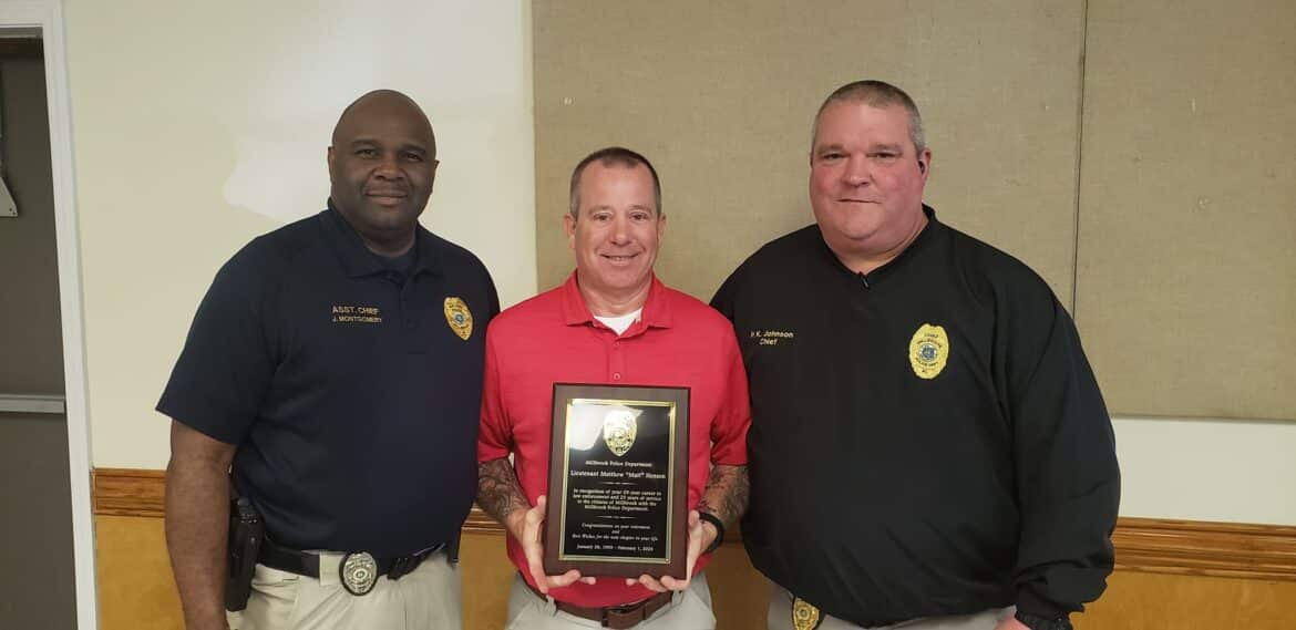“Matt came to work here in January of 1999 and I had just recently been made sergeant,” Police Chief P.K. Johnson said at the ceremony. “He came to work for my shift. I was told ‘make or break him.’ Matt was very young at the time and had been in law enforcement prior to coming to Millbrook, but he did not have a lot of experience. He needed to have a little coaching, and I was happy to do that.”