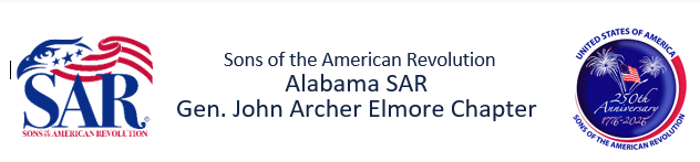 The General John Archer Elmore Chapter of the Sons of the American Revolution honors our Revolutionary War patriot ancestors by promoting patriotism, serving our communities, and educating and inspiring future generations about the founding principles of our country. In conjunction with the upcoming 250th Anniversary of the Declaration of Independence, we honor soldiers of the American Revolution buried in the River Region of Central Alabama.
