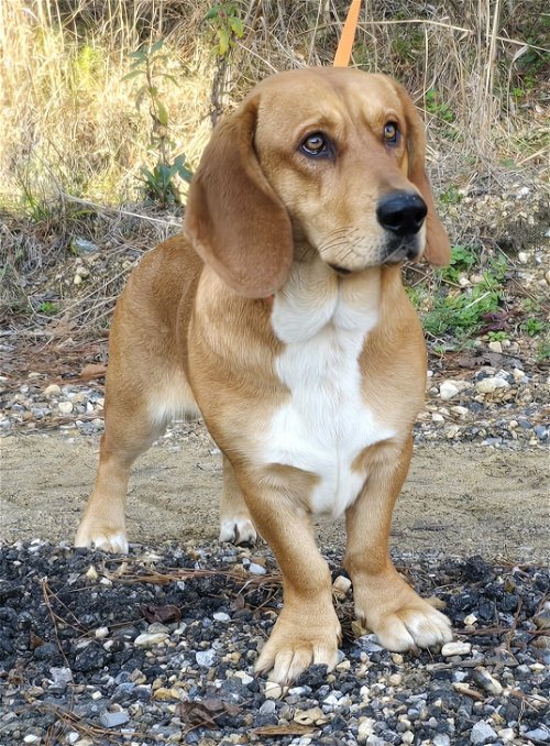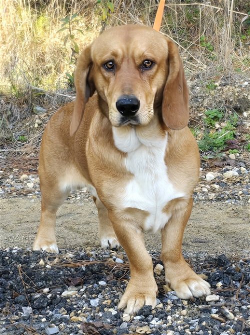 Copper is a one-two-year-old male Basset mix, 50 lbs, handsome as can be. He is great with other dogs and pigs but not good with chickens as he thinks they are too tasty. Good with children. Friendly fella.