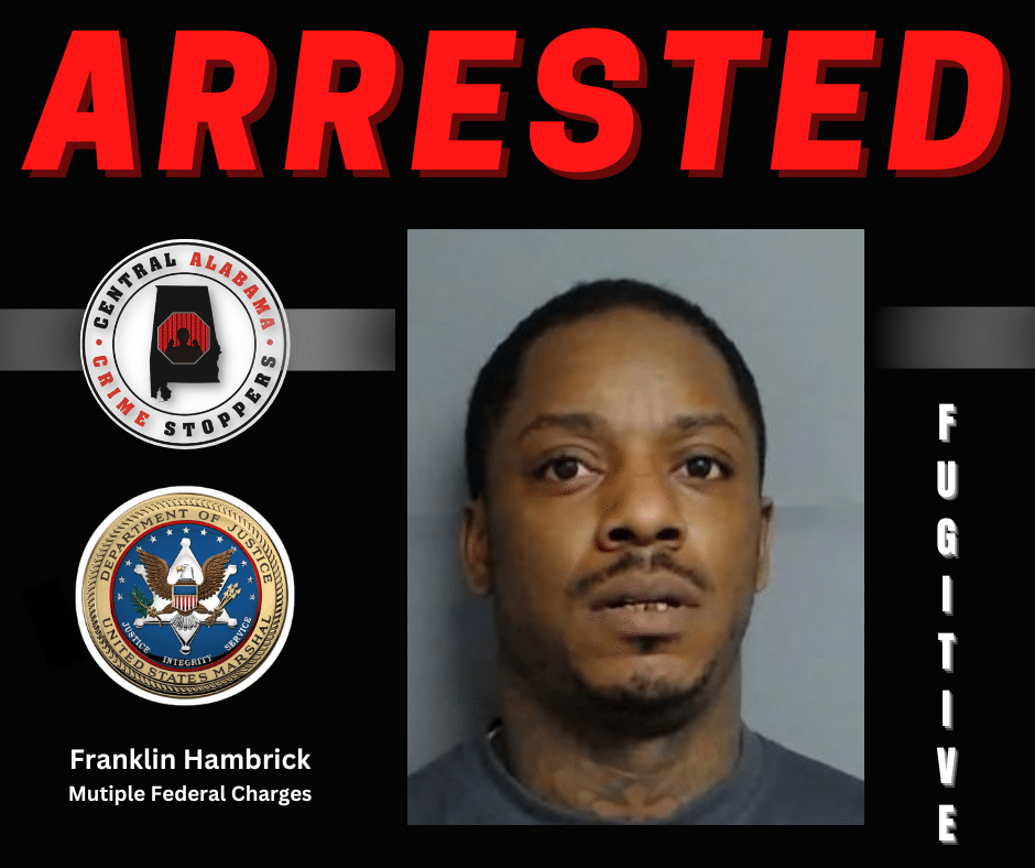 The United States Marshals Gulf Coast Regional Task Force notified Central Alabama CrimeStoppers on February 24, 2024, and advised fugitive, Franklin Douglas Hambrick, 34, was located.