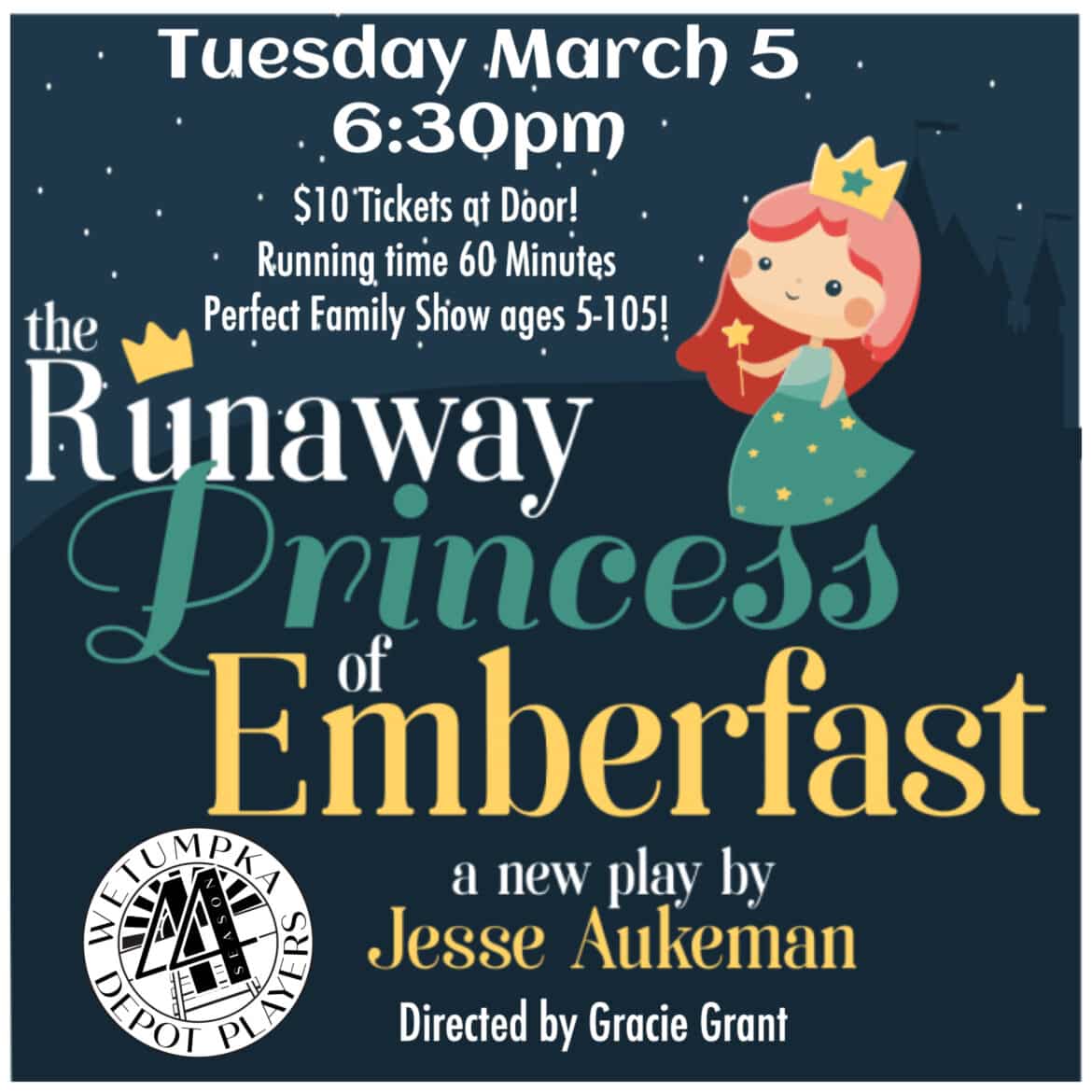 Join the Wetumpka Depot Players for a season extra that’s perfect for the entire family. The Runaway Princess of Emberfast is an exciting and adventure-filled new play! The limited run will take the Depot stage on Tuesday March 5 at 6:30 p.m.
