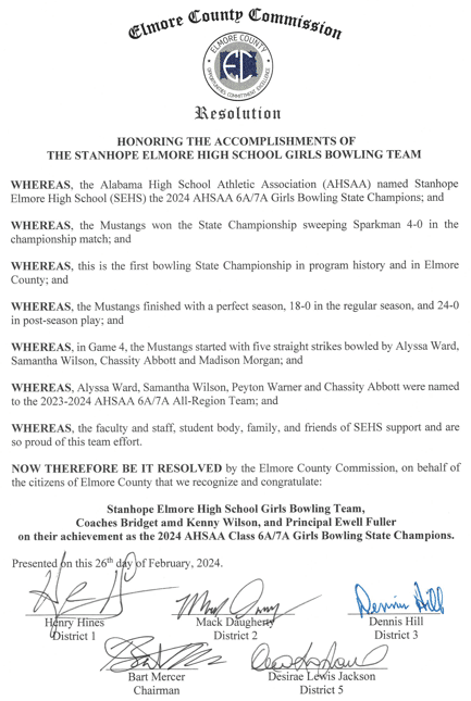 The SEHS Girls’ bowling team was invited to the Elmore County Commission meeting Monday, to be recognized on their 2024 6A/7A State Championship. They made it through the entire season undefeated.