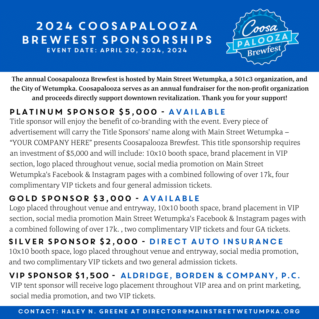 Join us for the fifth annual Coosapalooza Brewfest in Downtown Wetumpka! This is a fundraising event for Main Street Wetumpka. All proceeds from this event go to Main Street Wetumpka’s mission of downtown revitalization.