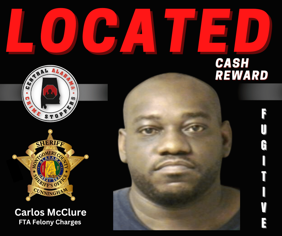 As requested by the Montgomery County Sheriff’s Office, McClure was placed on Central Alabama CrimeStoppers wanted list on their official website, www.215stop.com, on March 5, 2024. On Thursday, March 7, 2024, an area law enforcement officer was approached by a concerned citizen who was aware of the CrimeStoppers lookout for McClure. Investigators reached out to CrimeStoppers staff for additional details, and staff were able to confirm the active warrants on McClure. Thanks to the brave citizen’s information and a great partnership between CrimeStoppers and law enforcement, McClure was located a short time later. McClure was taken into custody by law enforcement on two felony charges.
