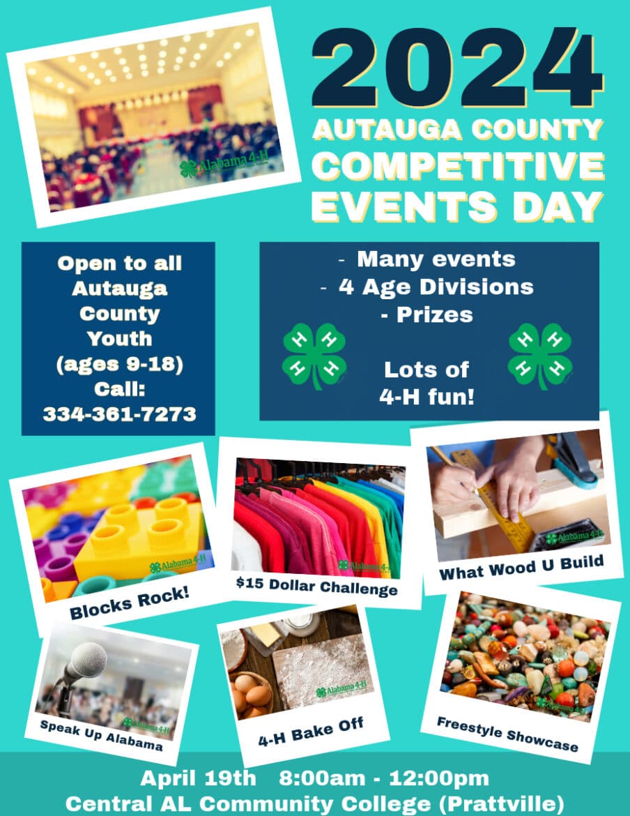 We are so excited to open registration for our second annual Autauga County 4-H Competitive Events Day! Enter one of the many events today! All youth from Autauga County are eligible, but spaces are limited per age category! Youth may register for up to 3 events!