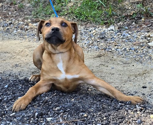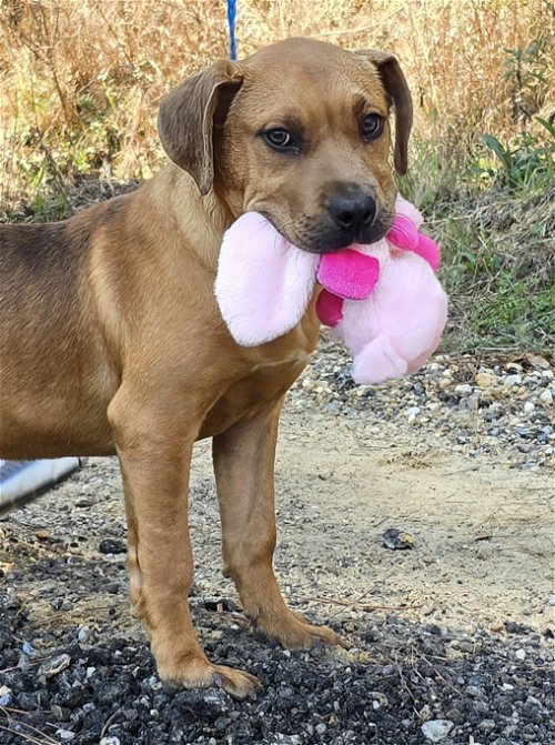 Jackie is a female, 6 1/2 months old, 40 lbs. She was found as an abandoned, skinny pup and brought to us. Jackie is super sweet, loves toys, great with other dogs and she just loves to cuddle.