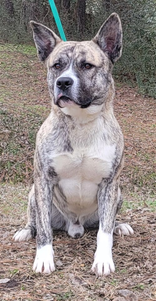 Doughy is a two-year old male that looks like he could be a Pit/Akita but certainly could be other mixes. He is 65 lbs, found as a stray and brought to us, never reclaimed. He is an absolute sweetheart, shy at first but then a huge love bug and wants nothing but attention. He knows sit and down and has pretty good recall. Will play fetch but also easily distracted and LOVES car rides. He seems great with other dogs, actually scared of cats. Doughy came to us heartworm positive and completed his treatment last week – just one of so many we have to treat because of not being on heartworm prevention.