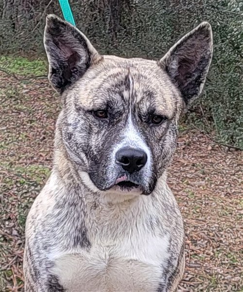 Doughy is a two-year old male that looks like he could be a Pit/Akita but certainly could be other mixes. He is 65 lbs, found as a stray and brought to us, never reclaimed. He is an absolute sweetheart, shy at first but then a huge love bug and wants nothing but attention. He knows sit and down and has pretty good recall. Will play fetch but also easily distracted and LOVES car rides. He seems great with other dogs, actually scared of cats. Doughy came to us heartworm positive and completed his treatment last week – just one of so many we have to treat because of not being on heartworm prevention.