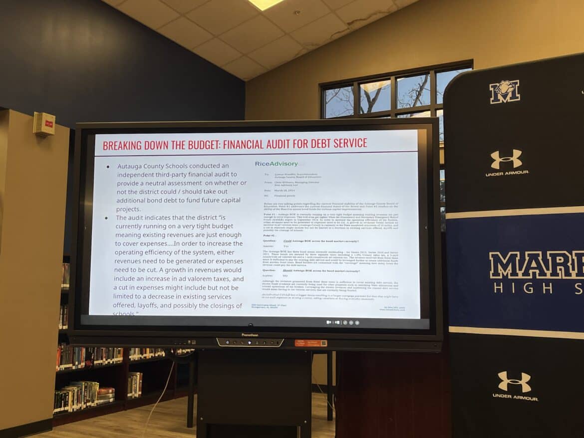 Woodfin went on to explain the analogy given to him from Rice Advisory. Stating that ACS qualifies to buy the “bigger house”, but then ACS can’t have a car payment, can’t go out to eat, and money would extremely tight, even more so than it already is. Loans can technically be pulled out, but then what happens when Prattville High School needs a $3 million AC unit again or a repair? Payroll doesn’t get paid, Woodfin explained.