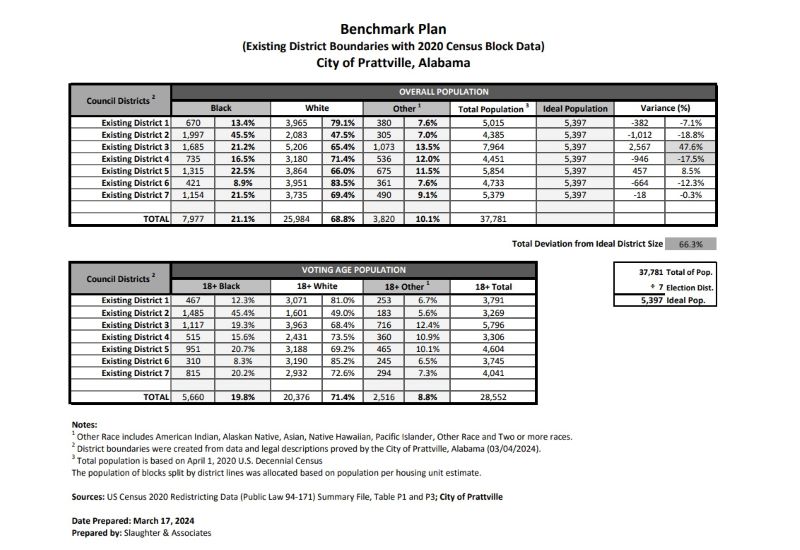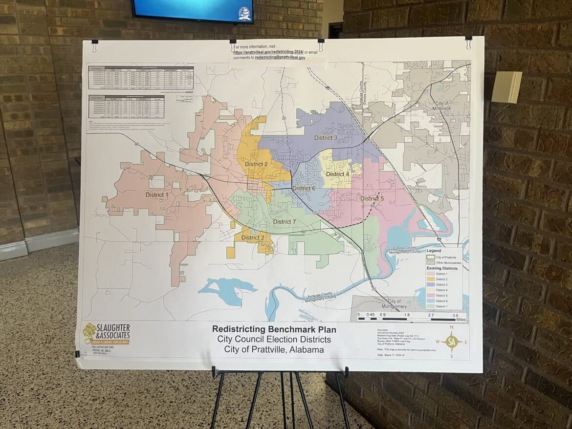 Currently there’s a benchmark plan in place with Slaughter and Associates Planning Firm for the new city council districts, using the 2020 census block numbers. The Benchmark plan is publicly available online and can be found here at Redistricting – City of Prattville (prattvilleal.gov). All input and suggestions will be recorded from the upcoming public hearings and via email [email protected]
