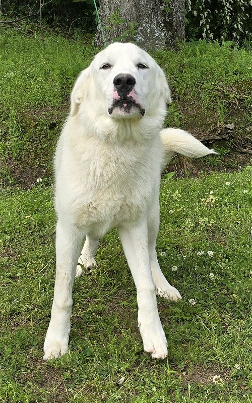 Finley is an eight-month old male Great Pyrenees mix, about 80 lbs. Surrendered to us for escaping his 4-5′ fence to go eat neighboring chickens so he needs a 6′ fence to keep him home safely. We were told he housetrained, good with children, other dogs and cats. He is a big goofy boy who loves head scratches and attention and is very easily distracted.