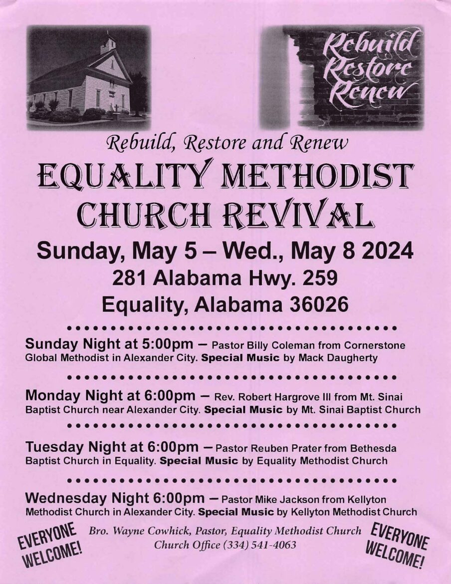 EQUALITY, ALABAMA – The Equality Methodist Church is excited to announce its upcoming revival event “Rebuild Restore Renew” May 5-8 at Equality Methodist Church located at 281 Alabama Highway 259 in Equality, Alabama. Dynamic pastors, speakers, special music and more will highlight these impactful messages centered on the importance of the church and revival.