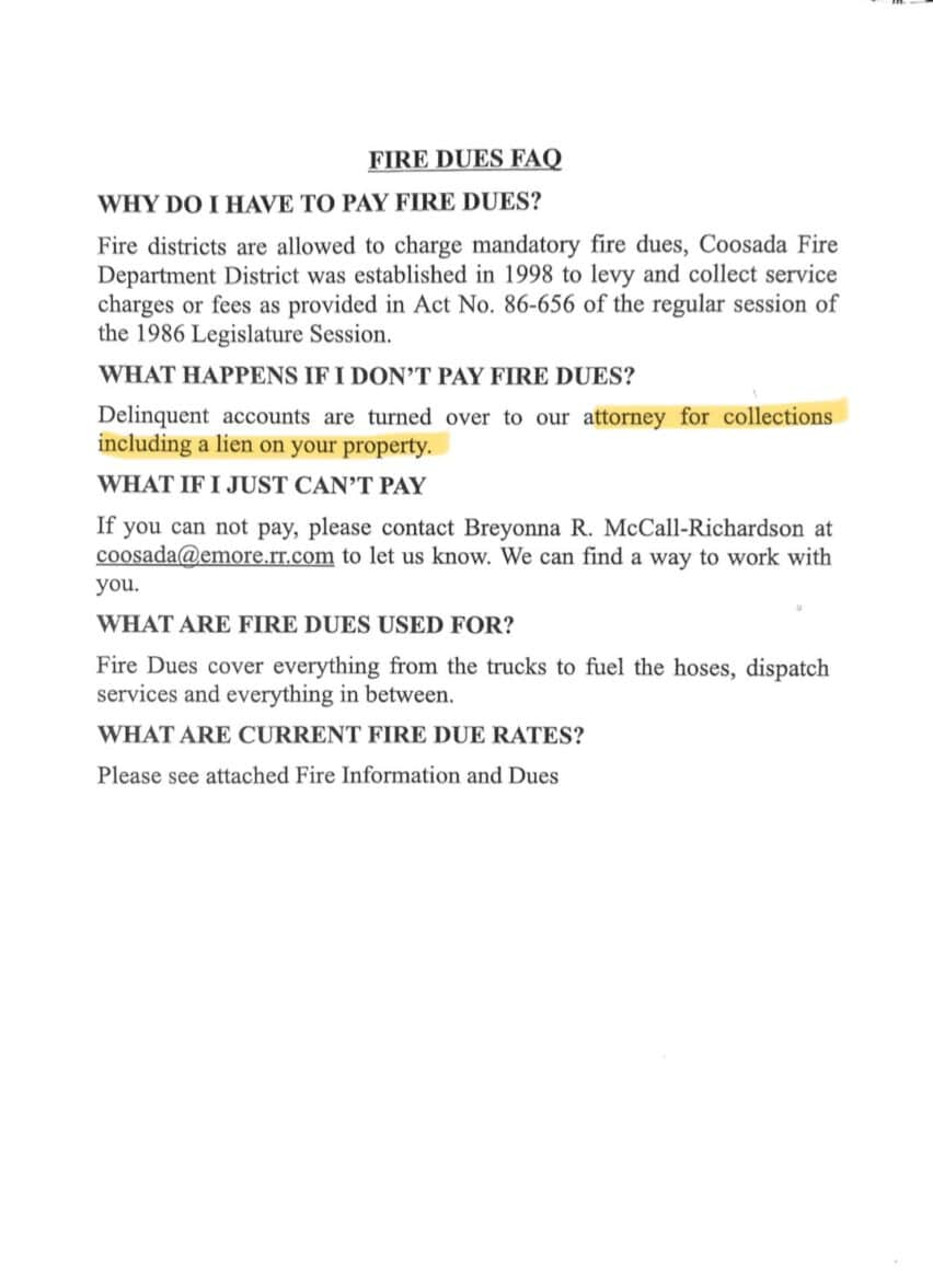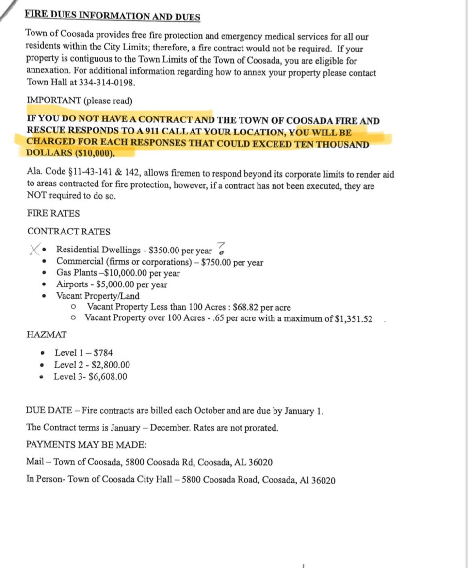 However, to respond to calls in the PJ, the town of Coosada has sent out a fee notice to all residents, which is based on three levels. If service is requested, and the home or business owner has not paid the yearly fee, substantial charges up to and perhaps above $10,000 could be levied. (See graphics below for those fees and more information.)