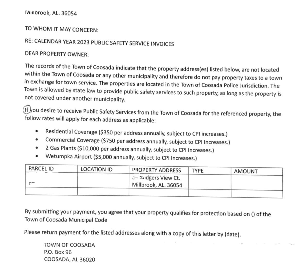 In January of 2024 Wright said that residents in Rodgers View received a letter from the town of Coosada outlining three options to continue emergency services. They could annex into the town of Coosada, or pay a contract rate of $350 a year (no description of what this rate coves, or Pay per call and be charged in excess of $10,000, where failure to later pay could result in being turned over to collections and the Town of Coosada placing a lien on their property.