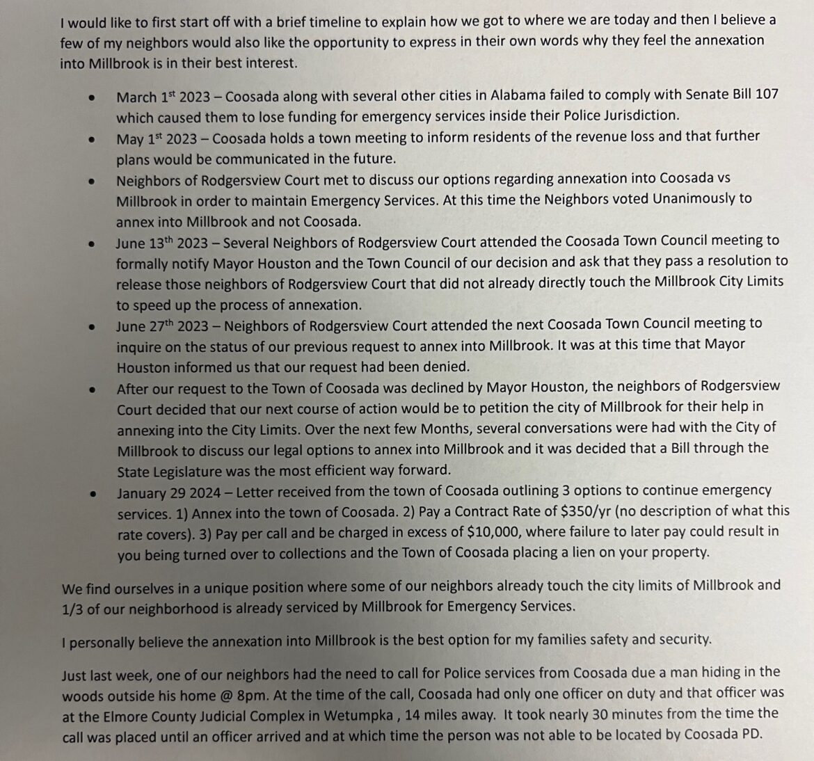 In June of last year, the residents approached the Town of Coosada City Council and made a request to be allowed to annex into Millbrook. Two weeks later they attended another meeting to follow up and Wright said Coosada Mayor Jim Houston then declined their request. This is disputed by Coosada Mayor Houston. More on that below.