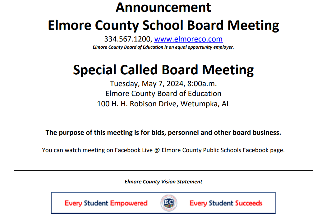 Special Called Board meeting for Elmore County is May 7