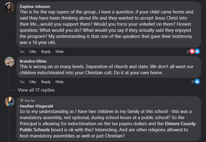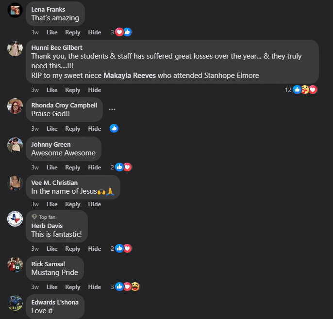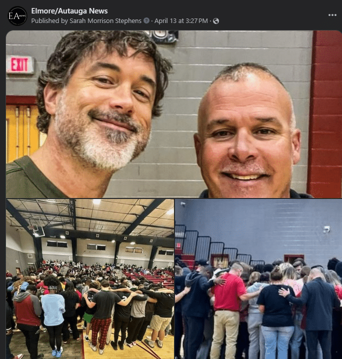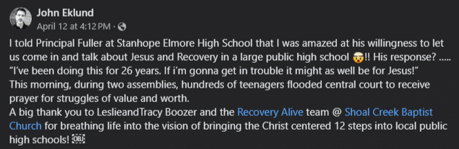 In a post about the assembly on Facebook, Eklund explained he “told Principal Fuller at Stanhope Elmore High School that [he] was amazed at his willingness to let [them] come in and talk about Jesus and Recovery in a large public high school.” He reported that Principal Fuller’s response was, “I’ve been doing this for 26 years. If I’m gonna get in trouble, it might as well be for Jesus!”