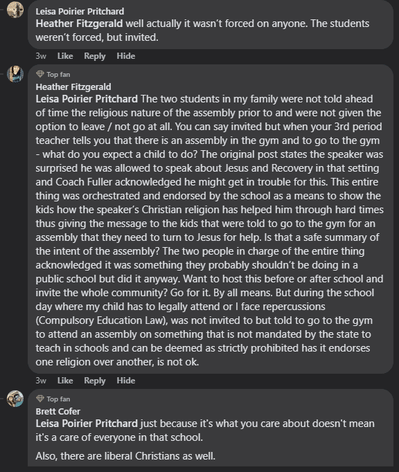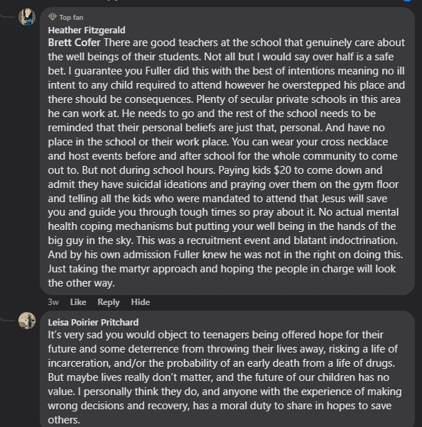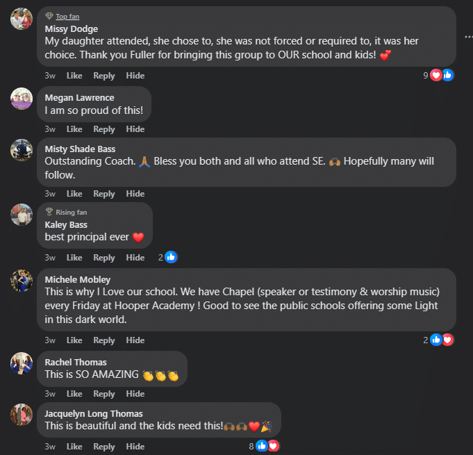 Since that post was made there have been 690 likes and 122 comments. The majority of the comments were positive, praising school officials, and saying programs such as this should be more common in school. But there was also another side to that, including those who felt a Christian agenda, or any religious agenda, should not be pushed to students in a public school.