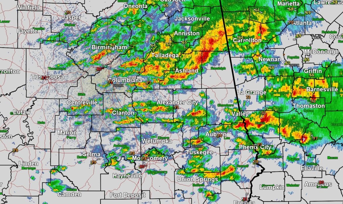 10am: The Anniston Airport recently measured a wind gust to 54 mph. Showers and thunderstorms continue to move eastward. As of 9:00 am, a tornado watch has been issued for parts of Alabama and Georgia until 4 PM CDT. Clusters of showers and thunderstorms will continue to affect central Alabama into this afternoon. While the main threat should be damaging winds, a couple tornadoes and large hail could occur as well.