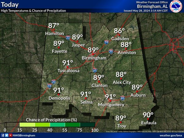 A 20 percent chance of showers and thunderstorms after 4pm. Mostly sunny, with a high near 87. Calm wind becoming northwest around 5 mph in the afternoon.