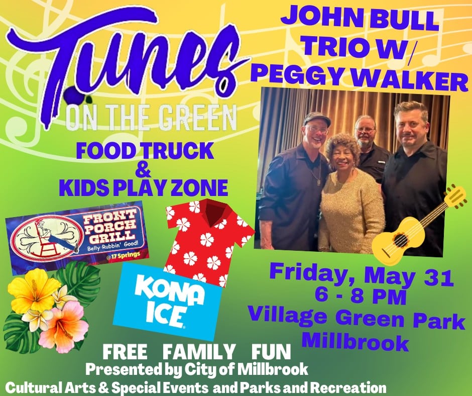 Tonight is a Hawaiian-themed concert with John Bull Trio and the soulful vocals of Ms. Peggy Walker. Front Porch Grill and Kona Ice of Prattville/Millbrook will be on site to provide dinner and cool treat needs.
