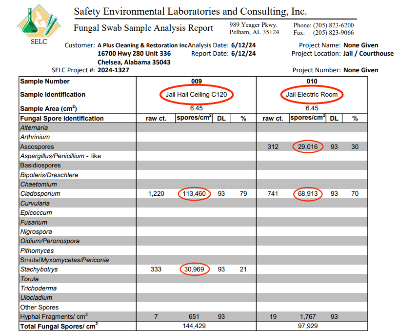 EMCโs testing revealed high concentrations of Cladosporium (everyday mold) throughout the jail that need to be remediated. The Sheriff also personally enlisted an expert, A Plus Cleaning and Restoration, which also identified similar trends. There was one area in both expertโs reports which identified a rare concentration of black mold (stachybotrys) but it was located in an isolated area which is in the upper level of the jail that has never been completed or occupied by inmates or staff and the mold was not growing or spreading.